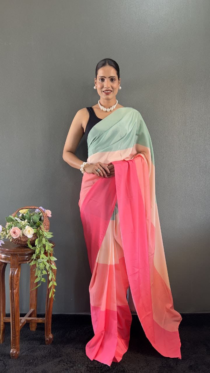 Capture the vibrant energy of a summer sunset with our Aqua Coral Striped Georgette Saree. To begin with, this stunning piece features an eye-catching, contemporary color-block design. Specifically, it transitions seamlessly between refreshing Mint Green/Aqua, soft Blush Pink, and warming Coral Pink. Consequently, you will effortlessly turn heads with this unique and modern color palette.