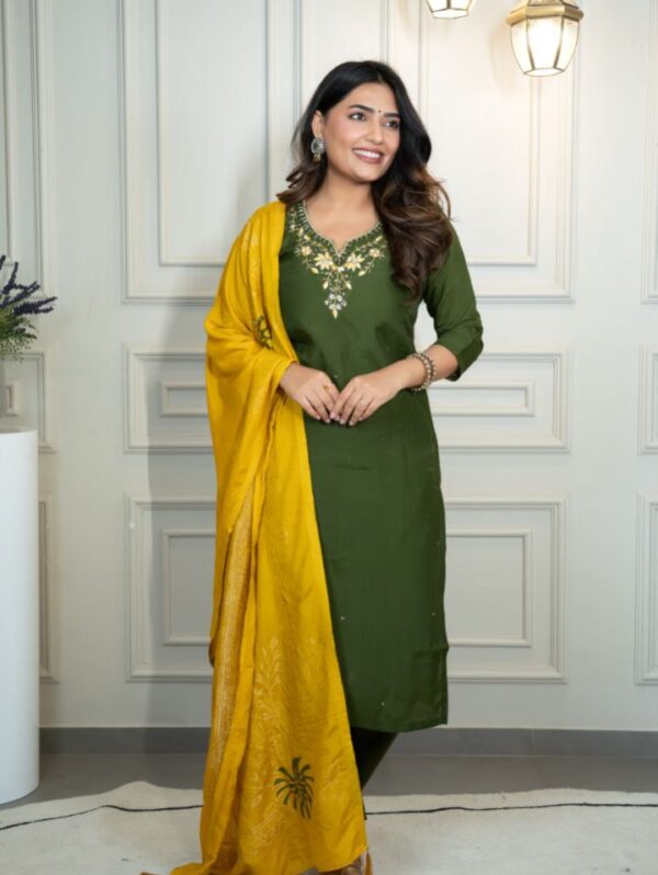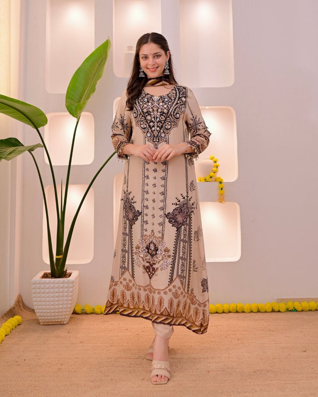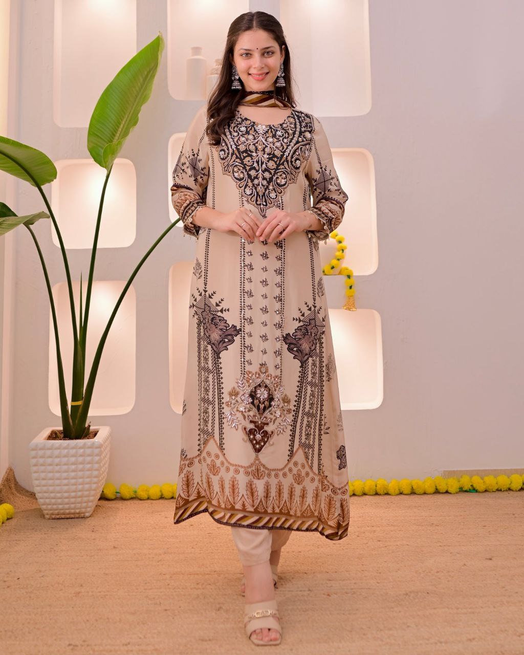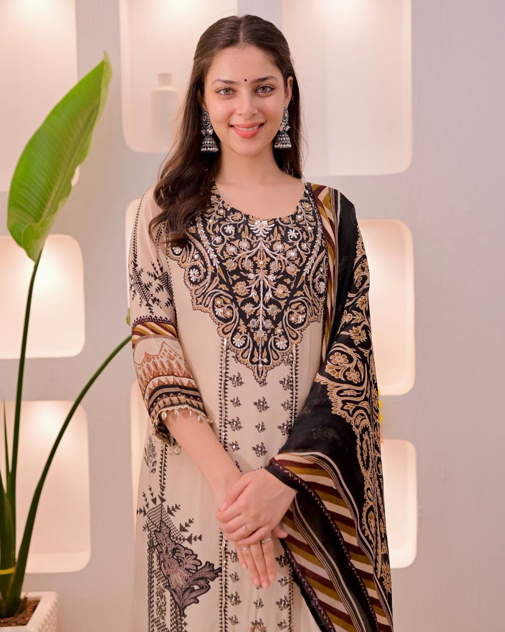 Redefine your ethnic wardrobe with this masterfully designed 3-piece set that balances traditional artistry with modern straight-cut sophistication. Perfect for those who appreciate intricate detailing, this ensemble features a striking contrast of earth-toned beige and deep ebony.