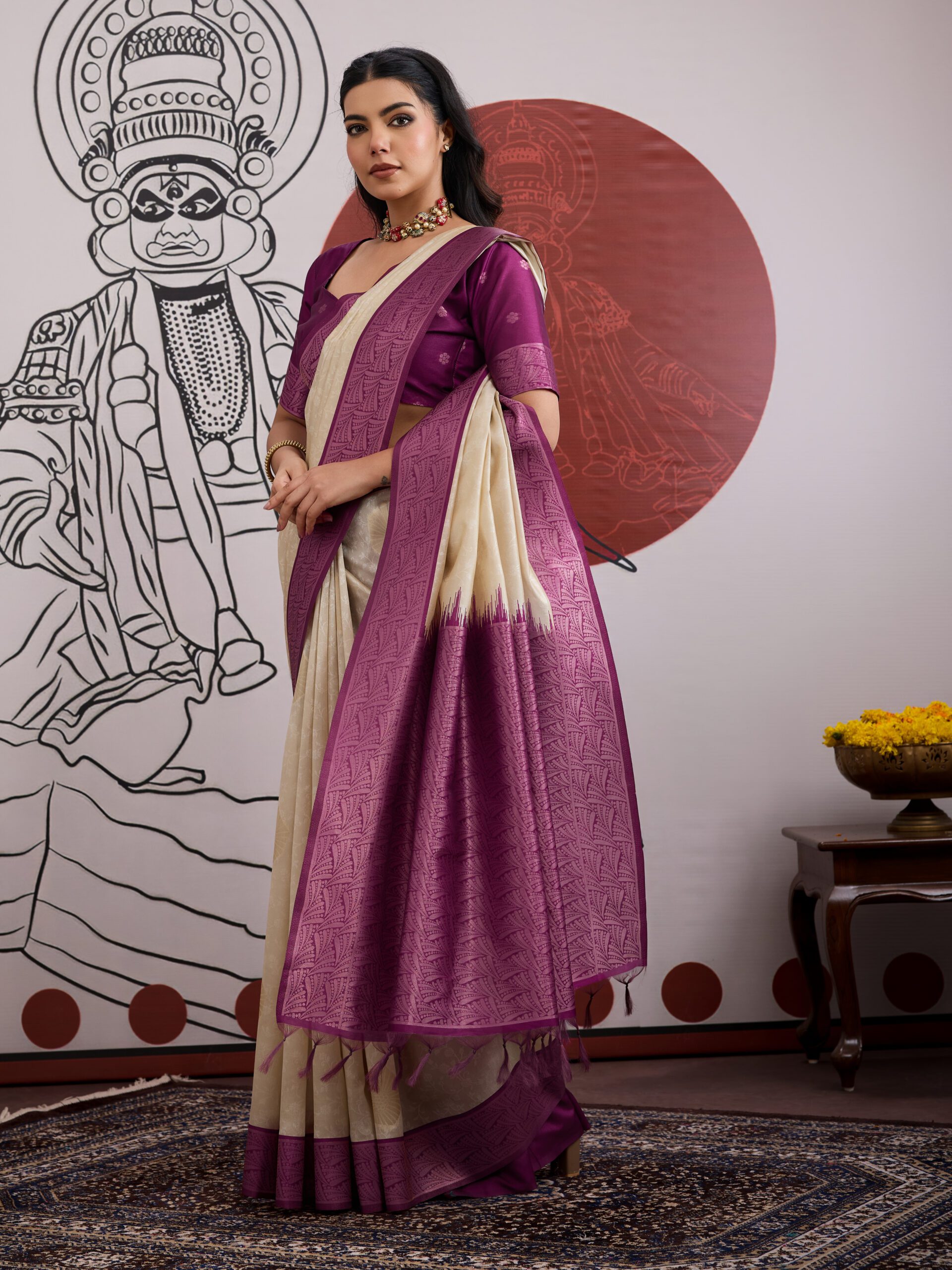 Contrast Border: A clean, wide border in Rich Purple provides a striking frame. We weave it with subtle Zari or tone-on-tone thread work, giving the design depth without being overtly ornate.