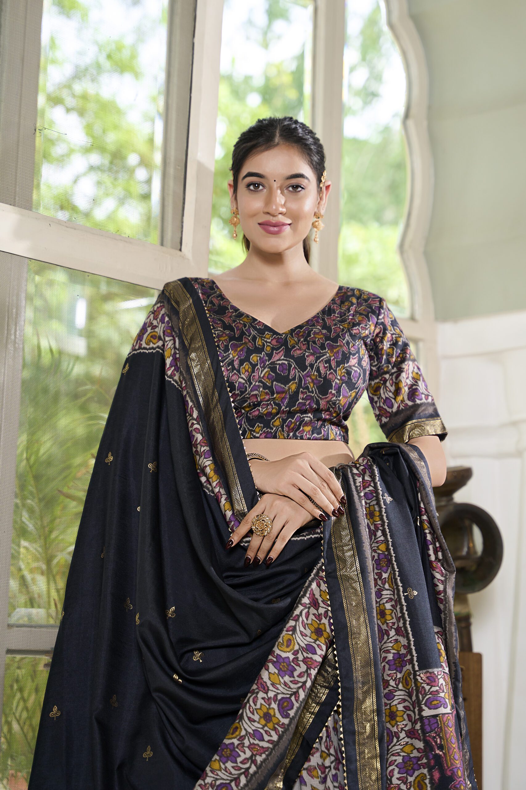 - Lehenga (Stitched)Lehenga Fabric : Tusser Silk Lehenga work : Floral Print With Foil Work Lehenga Waist : SUPPORTED UP TO 44